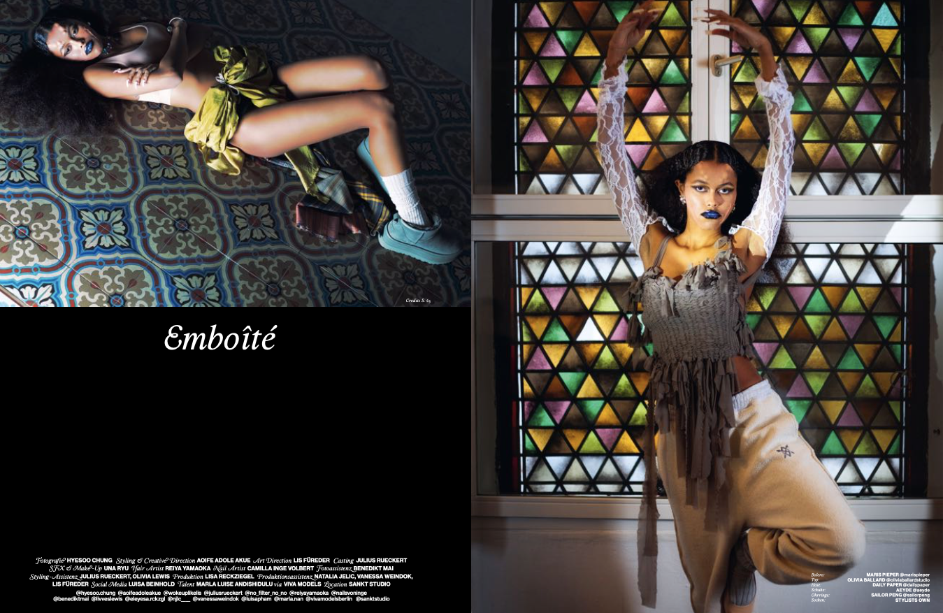 Photographer: Hyesoo Chung / Stylist and Creative Direction: Aoife Adole Akue / Casting: Julius Rueckert / Art Direction: Lis Füreder / Make Up and SFX: Una Ryu / Hair Artist: Reiya Yamaoka / Assistants: Julius Rueckert, Olivia Lewis / Photo Assistant: Benedikt Mai / Production: Lisa Reckziegel / Production Assistants: Natalia Jelic, Vanessa Weindok, Lis Füreder